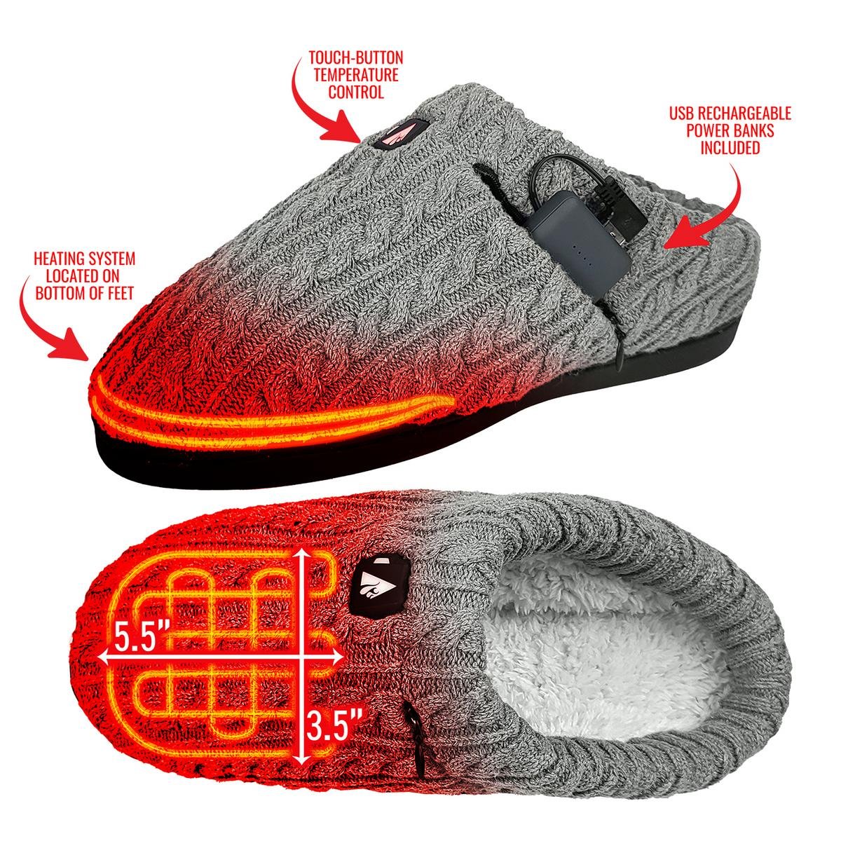 The Rechargeable Battery Heated Cable Knit Slippers are stylish, warm, and comfortable. Made out of a wool blend, their unique design and fuzzy lining make them an excellent choice for lounging around the house on a cold winter night. They are powered by rechargeable 5V batteries and can last up to 5 hours.