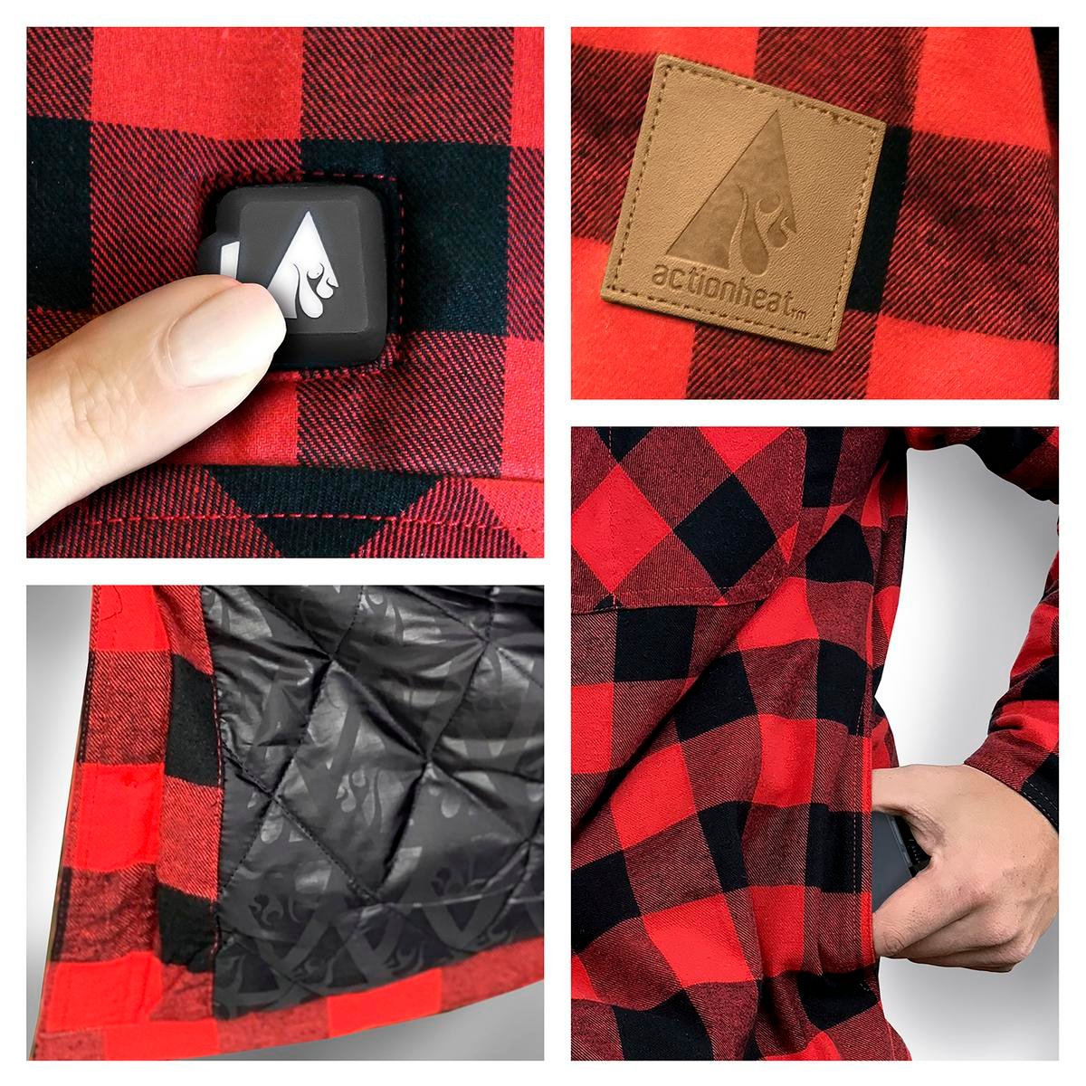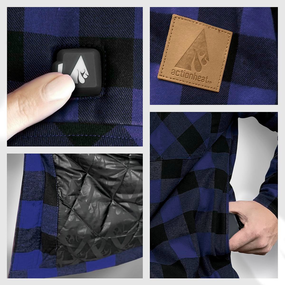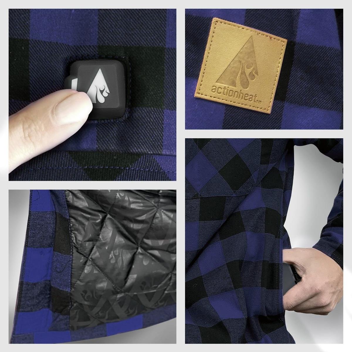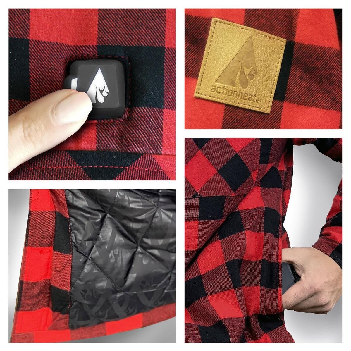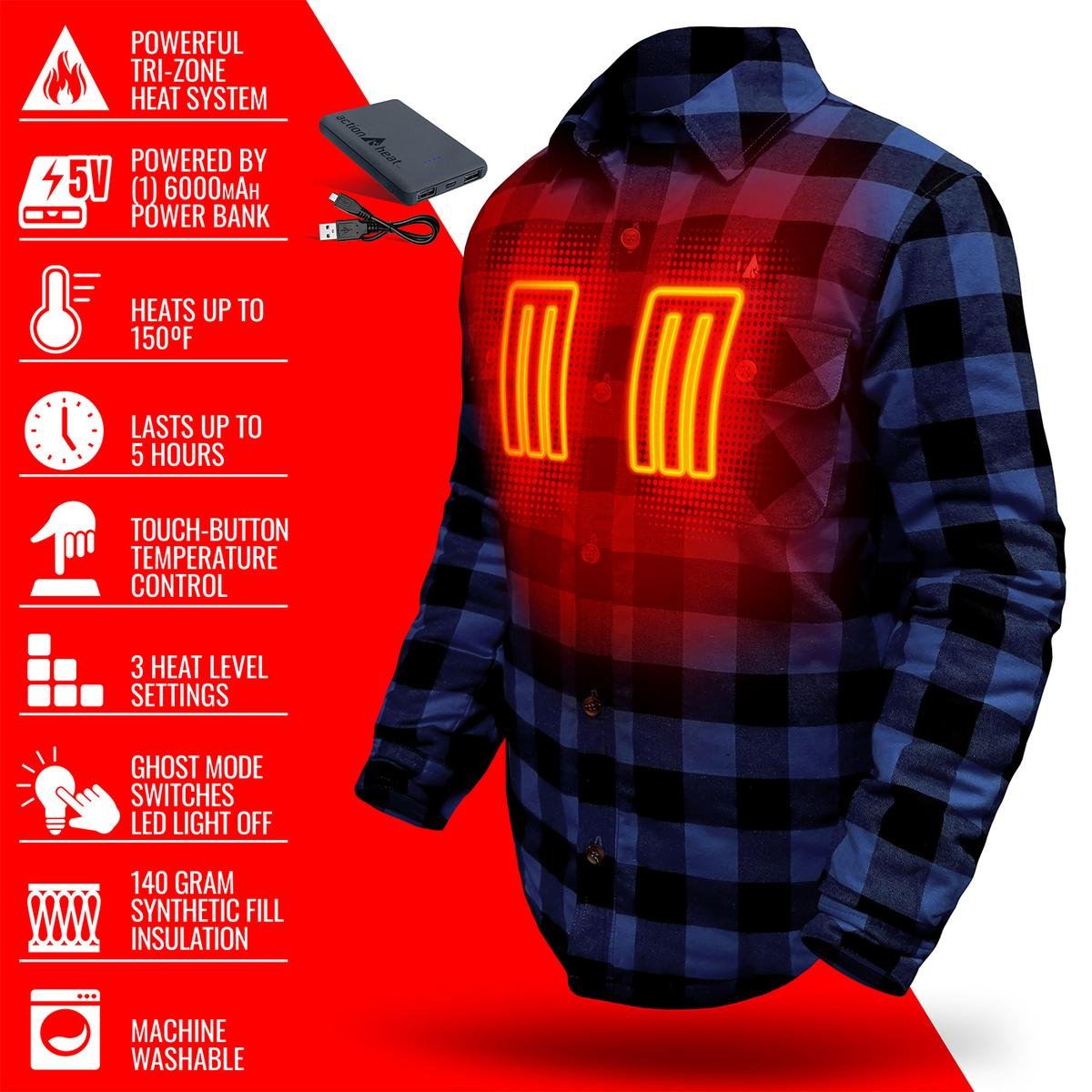 The flannel shirt comes with a super powerful 5-Volt 6000maH Power Bank. This power bank powers your garment and can also charge your phone, tablet, or any USB charged device. Note: Heating times will diminish if used to charge other devices. A touch-button LED button with 3 different heat settings, Low, Medium, and High, provides easy heat controls on the shirt.