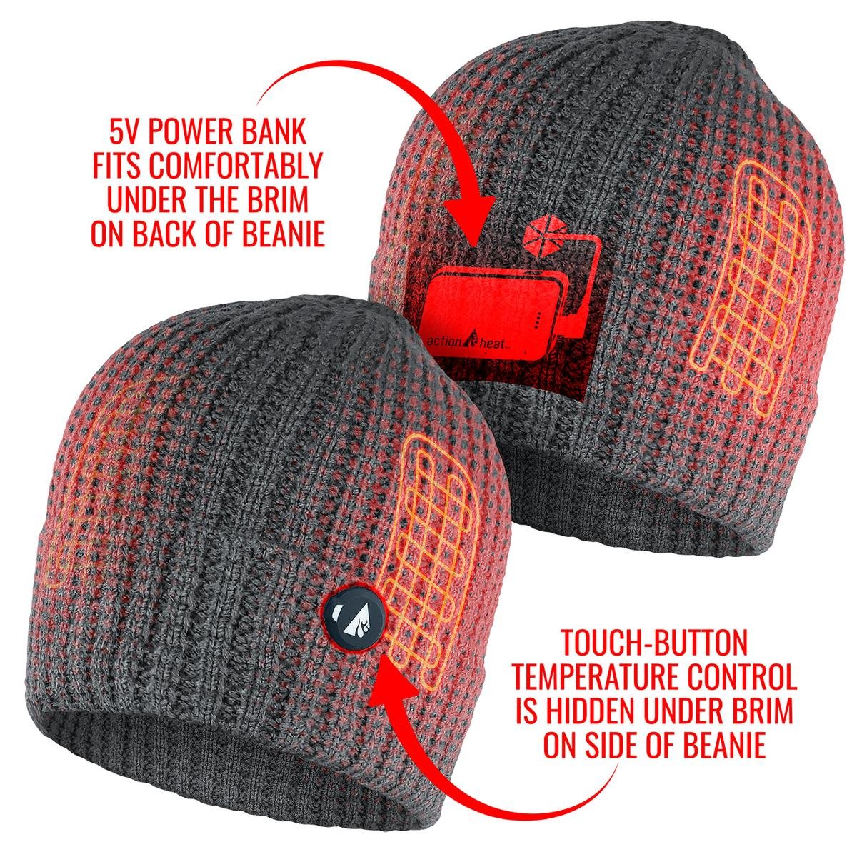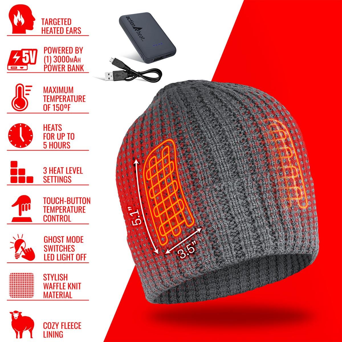The 5V Battery Heated Waffle Knit Hat is a stylish addition to our headwear line and was designed to keep your head warm when during winter activities. Thanks to the knit design and cozy fleece lining, the hat traps your head’s natural heat, and you will love the extra comfort of strategically placed heating panels on both ears.