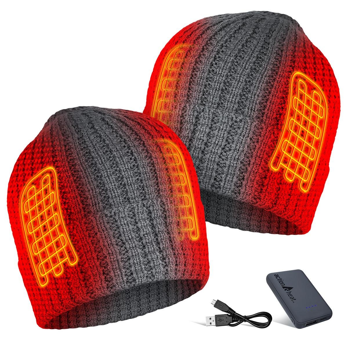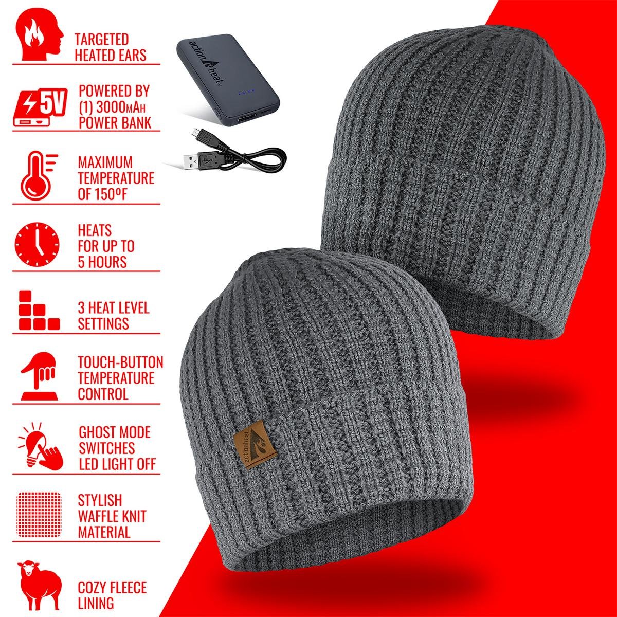 Once the waffle knit hat is powered on, the heating elements quickly heat up your ears and head in just a few seconds. The rechargeable 5V lithium-polymer batteries deliver 3 levels of heat, controlled by the temperature controller on the hat. The hat can reach a maximum temperature of 130F while lasting up to 4.5 hours.