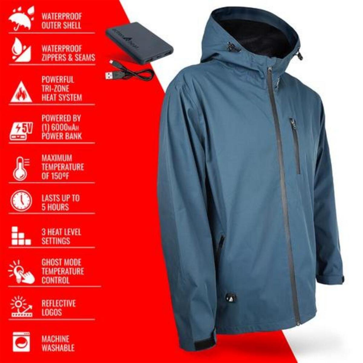The Men’s Heated Rain Jacket is the perfect blend of the utility of a rain jacket, combined with the superb heating performance of apparel. With the new fashionable design and attractive color, you can stay dry & warm even in wet conditions.