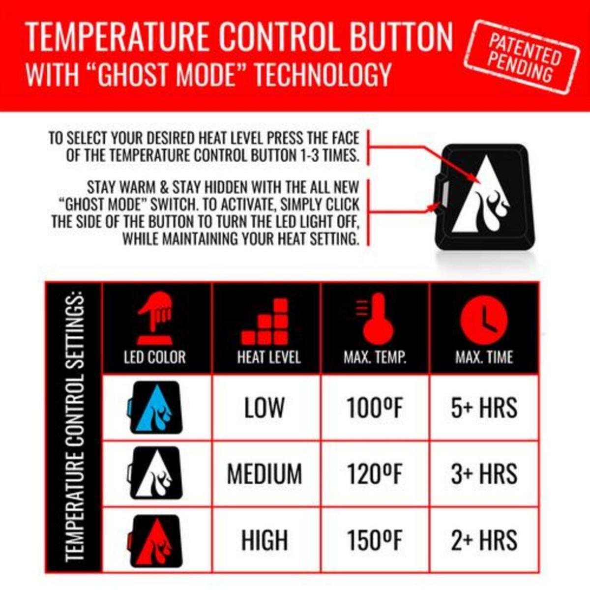 All jackets come with a super powerful 5-Volt 6000maH Power Bank. This power bank powers your garment and can also charge your phone, tablet, or any USB-charged device. Note: Heating times will diminish if used to charge other devices. A one-touch LED button with 3 different heat settings, Low, Medium, and High, provides easy heat controls on the jacket.