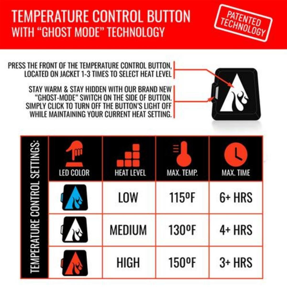 jackets come with a super powerful 5-Volt Power Bank. This power bank powers your garment and can charge your phone, tablet, or any USB-charged device. Note: Heating times will diminish if used to charge other devices. A one-touch LED button with 3 different heat settings, Low, Medium, and High, provides easy heat controls on the jacket.