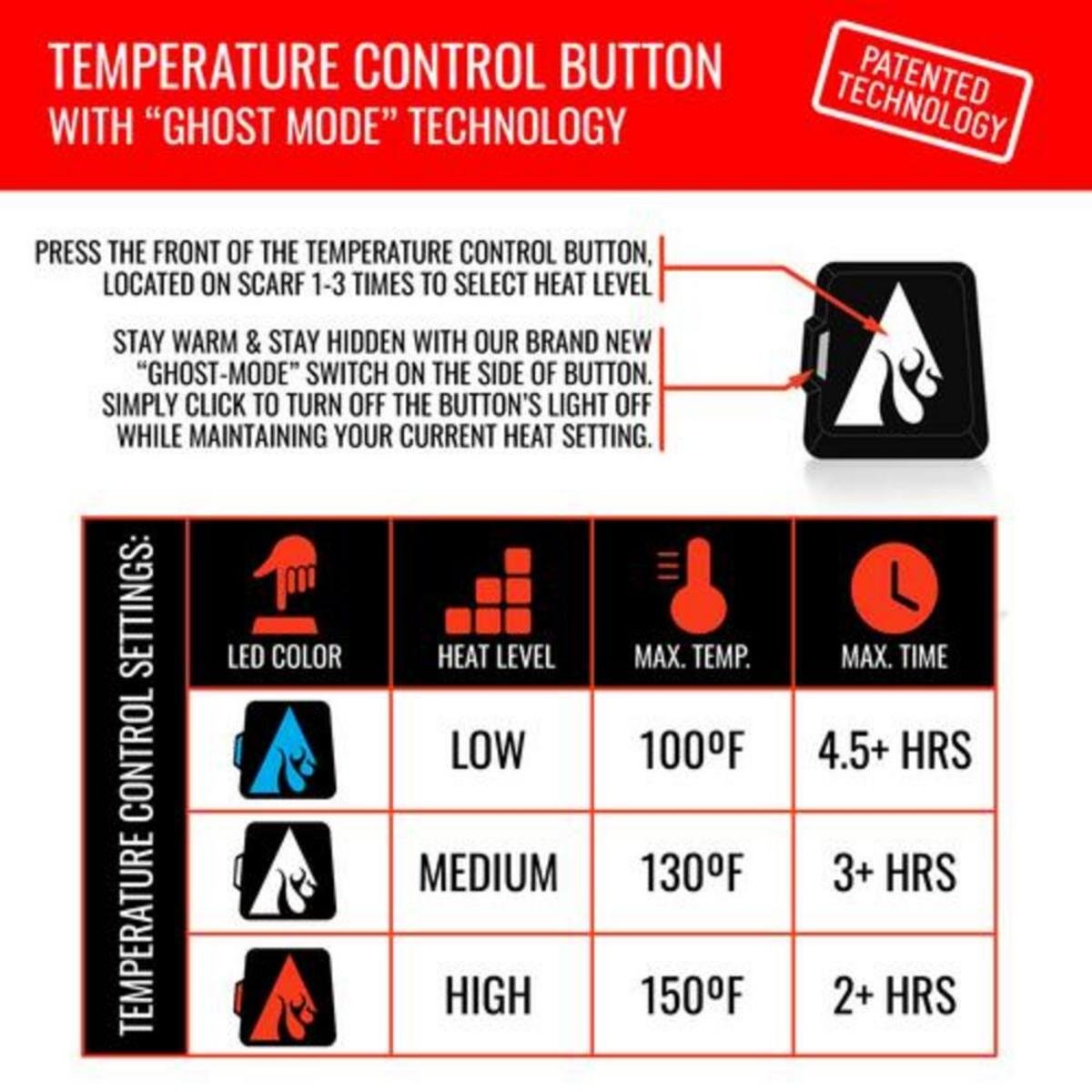 - Turn On – Press and hold touch-button control on the scarf for 3 seconds. Press touch-button to adjust the temperature.